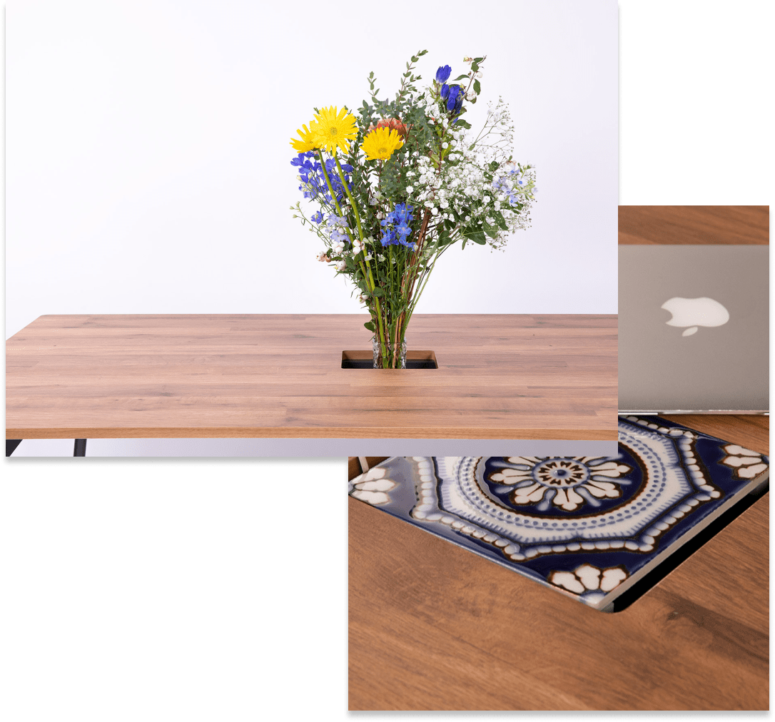 F1テーブルはケーブル収納、U1テーブルはディスプレイ収納のオプションがあります。ケーブル収納はパソコンなどの電源ケーブルの配線孔やアダプタの収納場所として、ディスプレイ収納はお好みのインテリアやコレクションの収納場所としてお使いいただけます。